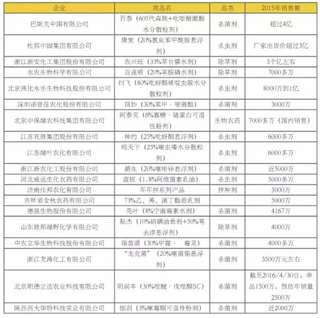 比如中國農科院植保所廊坊農藥中試廠阿泰靈(6%寡糖?鏈蛋白可濕性粉劑)是由中國農科院植保所副所長,中國生物農藥首席科學家邱德文研究員帶領研究團隊研發(fā)成功的生物農藥,從實驗室走向市場,花費了8年時間反復驗證和不斷完善,確保產品配方最優(yōu),2014年上市,僅2015年度,在中國市場的銷售額超過7000萬元。碧生是浙江新農自己創(chuàng)新的化合物,有自己的知識產權,通過有效成分衍生出碧系列性產品,最具代表性的就是碧生,2009年上市,現在年銷售額單品銷售額近5000萬。江蘇綠葉“鳴天下”是國內最早登記,規(guī)模最大的,針對小麥蚜蟲、水稻稻飛虱的高效殺蟲劑,不僅受到政府青睞,也是很多農戶的第一選擇,2015年單個產品銷售額就達到6000多萬。
